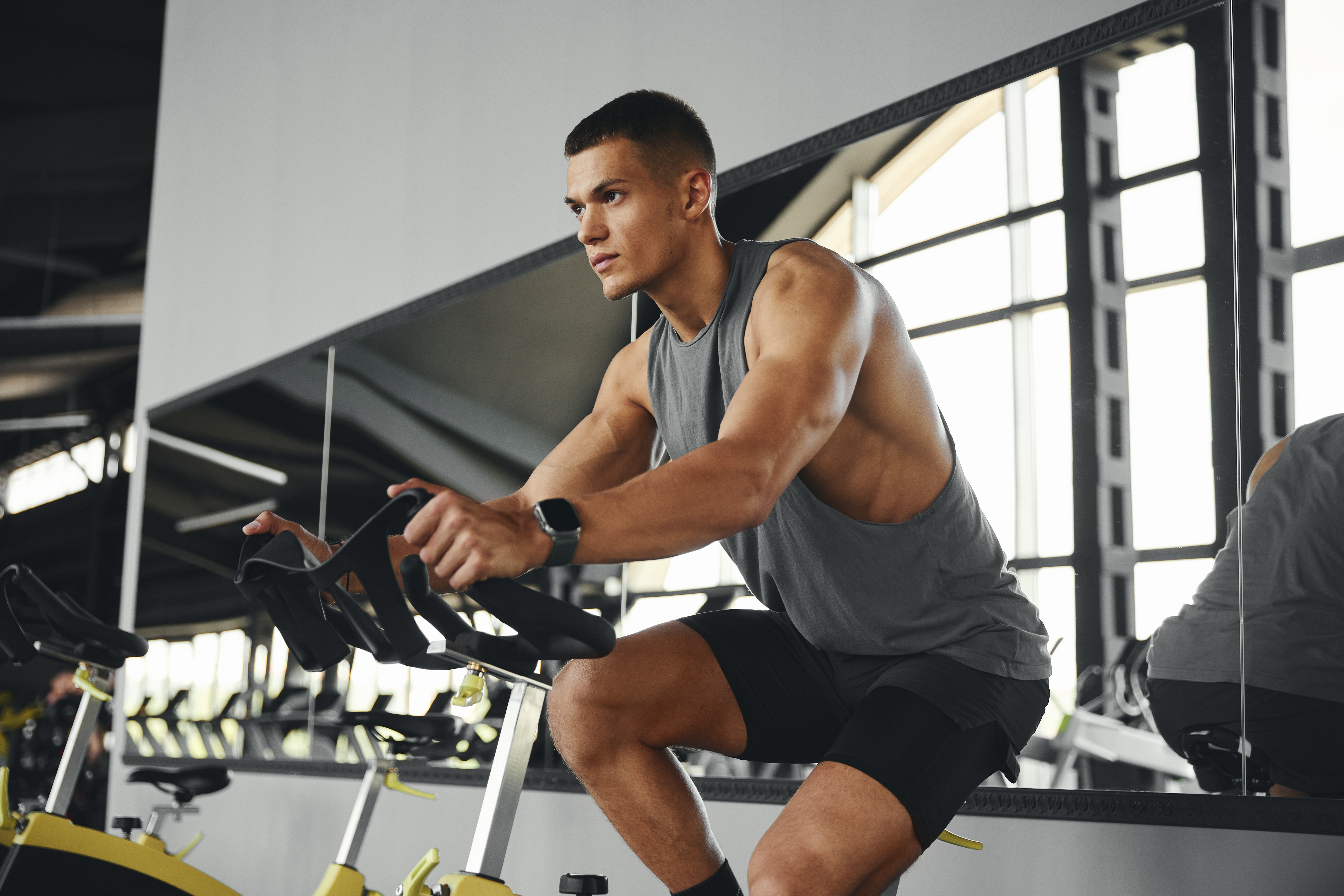 Fit,Young,Man,In,Sportswear,Riding,A,Stationary,Cycling,Bike