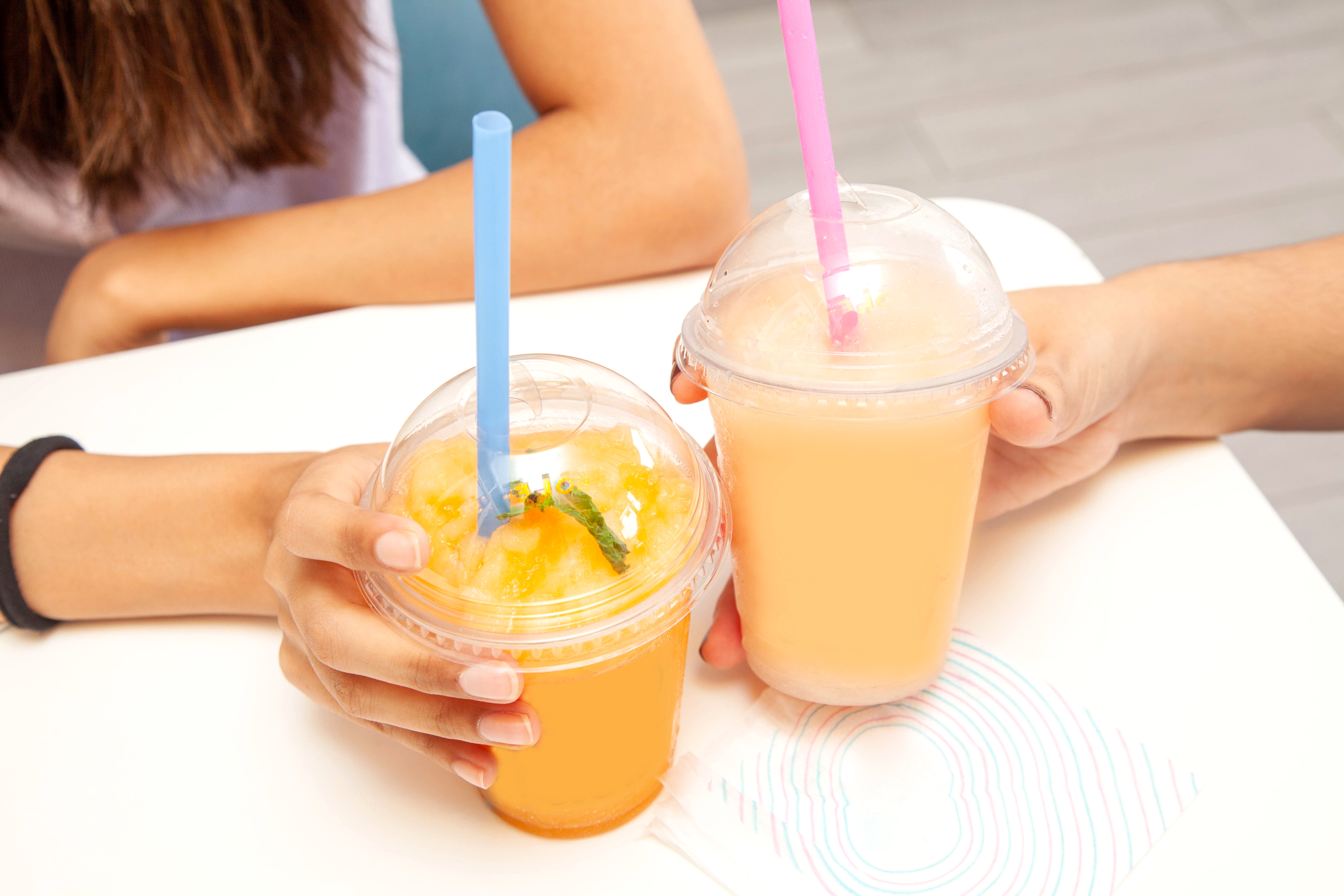 Friends,Holding,Drinking,Together,Fruity,Slush,Drinks.