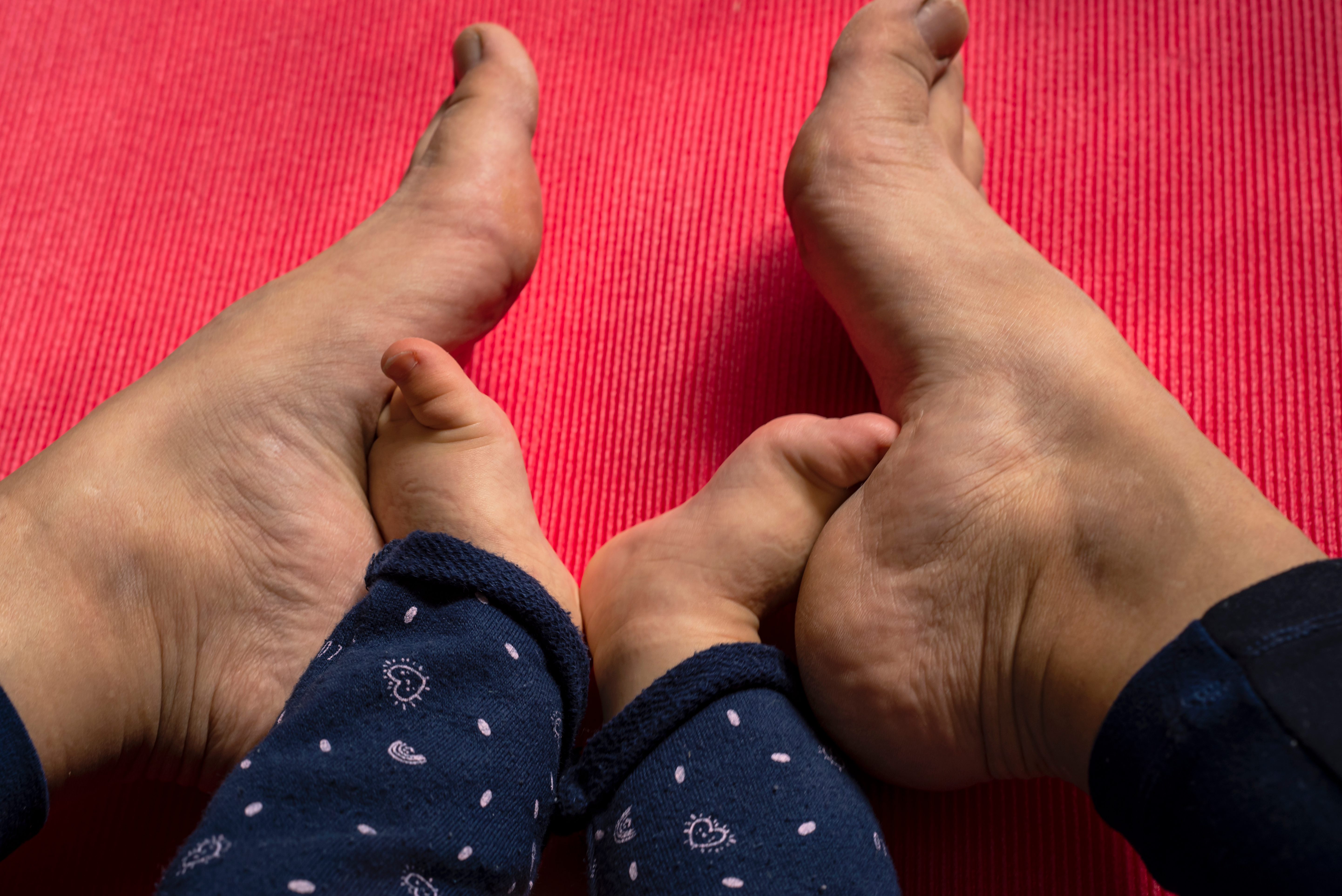 Crossed,Baby,And,Mother,Feet,Doing,Sport,On,Yoga,Red