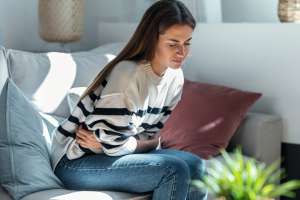 Shot,Of,Unhealthy,Young,Woman,With,Stomachache,Leaning,On,The