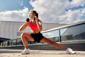 Woman,Performing,Fitness,Exercises,With,Weights,Outdoors,Under,A,Bright