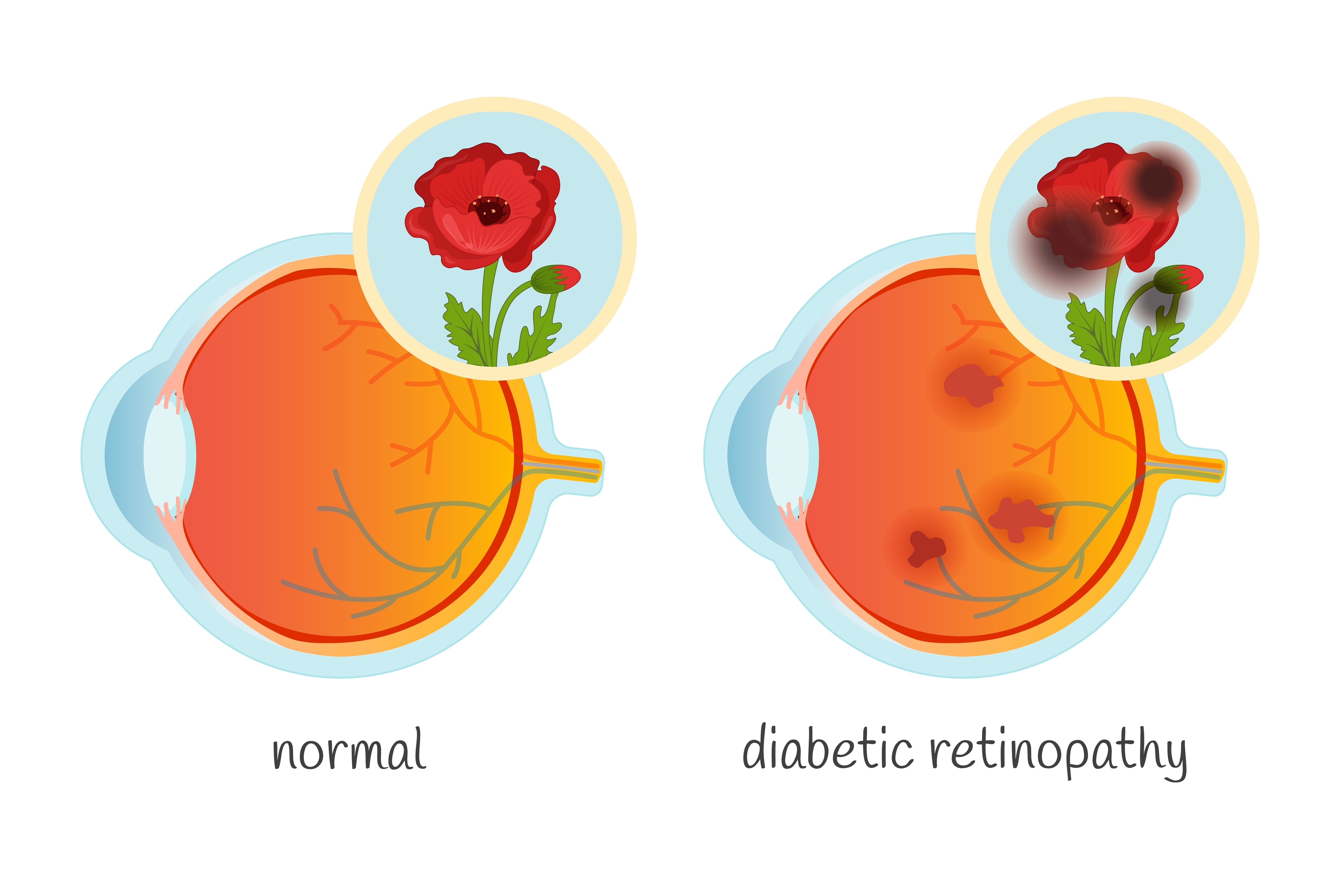 Είναι μια μικροαγγειοπάθεια του αμφιβληστροειδούς, που προηγείται από νευρωνική βλάβη του αμφιβληστροειδούς. Η φυσιοπαθολογία της είναι πολύπλοκη και πολυπαραγοντική. Μπορεί να οδηγήσει σε απώλεια της όρασης μέσω διάφορων μηχανισμών: αιμορραγία του υαλοειδούς, αποκόλληση του αμφιβληστροειδούς, οίδημα της ωχράς κηλίδας, ισχαιμία της ωχράς κηλίδας, νεοαγγειακό γλαύκωμα κ.λπ. Η επικράτησή της κυμαίνεται μεταξύ 25 και 30% και περίπου 6 έως 8% των ασθενών με διαβήτη τύπου 2 θα έχουν RD κατά την ανακάλυψη του διαβήτη τους.