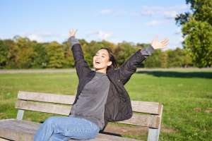Happy asian woman stretching her hands, sitting on bench with excited face, smiling pleased, feeling freedom, enjoying day in park